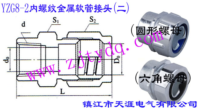 YZG8-2內(nèi)螺紋分別為英制管螺紋ZG1/2"、ZG3/4"、ZG1"和ZG1 1/2"四種螺紋,與其相配的金屬軟管分別為DN13,DN17,DN21和DN31四種。YZG8-2內(nèi)螺紋金屬軟管接頭(二)通常是和保護管相連接的。